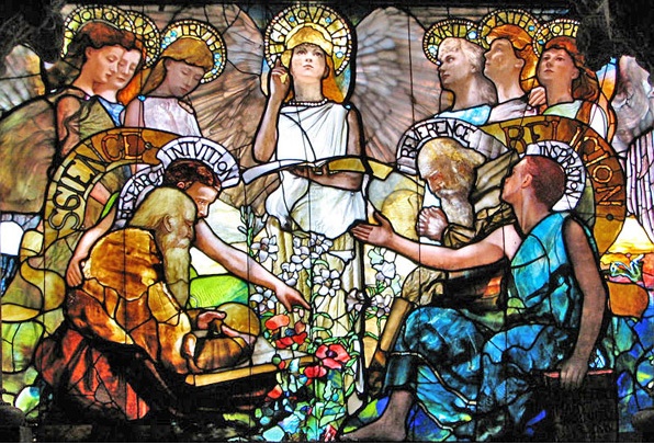 - The central panel of: Education 1890, a thirty-foot-wide stained glass window by Louis Comfort Tiffany and Tiffany Studios.