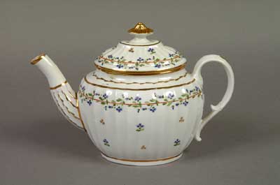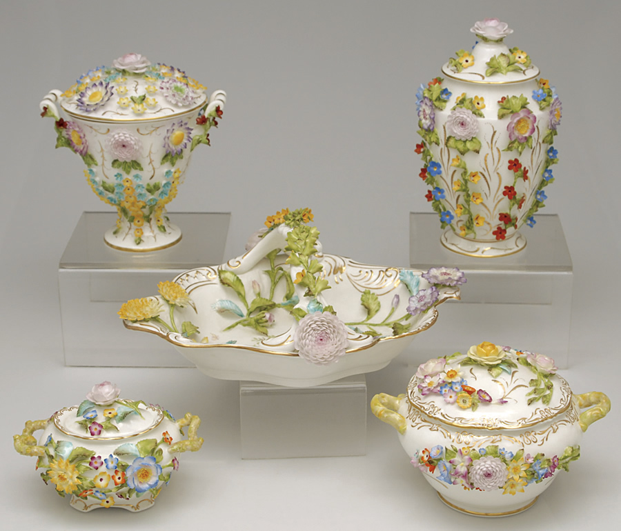 Table wares marked a revival of the fashionable rococo genre and became closely equated with Coalport and the more flowery rococo productions were soon referred to as ‘Coalbrookdale style’.