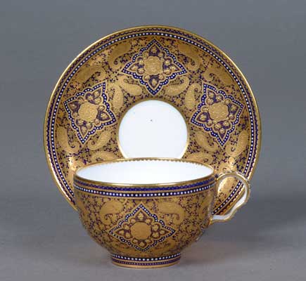A pattern, known as ‘Cashmere’ was first introduced at Coalport around 1873 and highlights the interest in all things oriental at the time. In 1878 the pattern was exhibited at the Paris Exhibition and a service was ordered by the Maharajah of Jaipur.