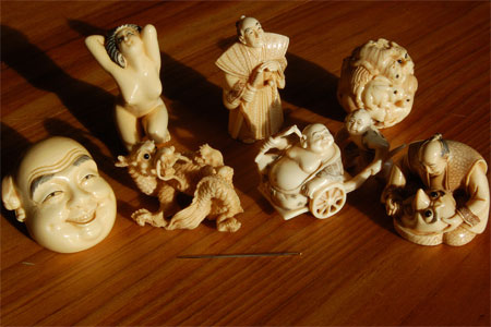 There are 19th century copies of earlier works that were carved by the Japanese to meet the demand from European collectors. These are excellent works of art but the difference in value between these copies and the original items can be a factor of ten. Almost all fakes are in ivory, not other materials, since ivory can be carved much more easily and faster.