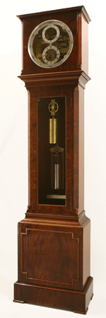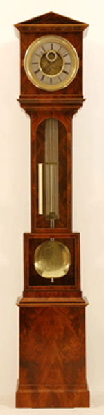 An English longcase regulator (Fig. 6). These clocks were produced for domestic use from the end of the 18th century through to the beginning of the 20th century. Prior to that most regulators would have been used in observatories and for scientific purposes. The regulator shown is exceptional in having a skeletonised dial signed for Hennessy, Swansea although the movement was made by Smiths & Sons of Clerkenwell, London. Apart from the skeletonised dial the case style is relatively typical of many of the flat top regulators made in the 1850s and 1860s.