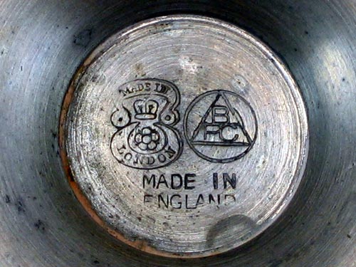 The words ENGLAND or ENGLISH PEWTER were only used after 1891, following a United States tariff law that required imported goods to bear the country of origin. An amendment of the tariff law in 1909 required the text to be changed to MADE IN ENGLAND, so any piece stamped with this is post-1909. The presence of these marks does not mean the item was actually exported to the US as many makers took the easy route and simply stamped all their wares.