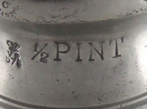Prior to the compulsory introduction of verification marks in 1835, pewterers often punched their own mark to indicate the capacity standard to which the measure conformed. These take the form of a crown over the monarch’s initials. The most common ones are: