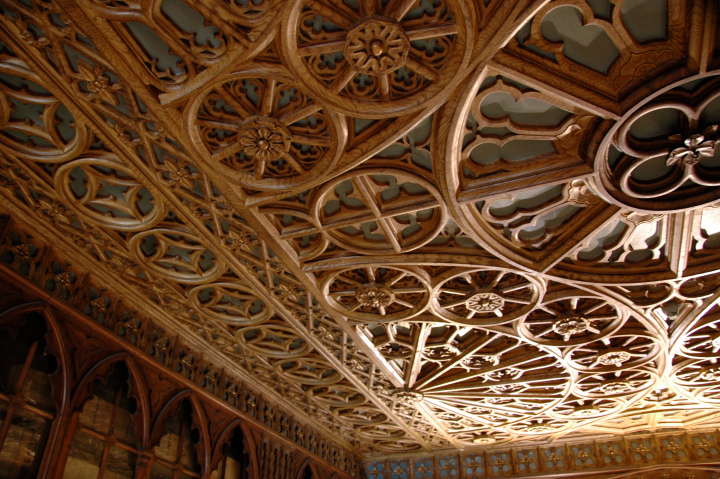 - ecclesiastical details – pointed arches, ogee arches, stained glass