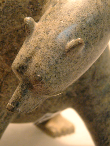 From the eastern Arctic come a variety of styles. Some are rooted in a love of naturalism and an interest in both wildlife and the spirit world, often fashioned into almost impossibly thin shapes or delicately balanced works. Some incorporate a love of the flamboyant, the dramatic and the decorative. The stone ranges from many beautiful shades of green to white dolomite and varicoloured marble. Green stone, especially the apple-green and cream-coloured shades are particularly highly prized.