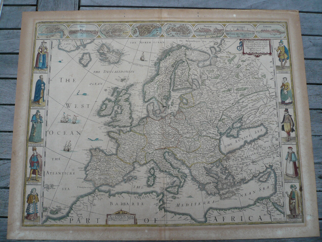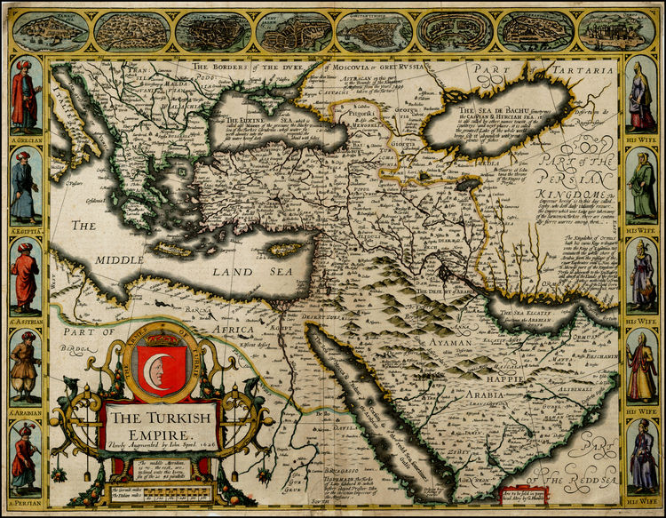 In 1627, just two years before his death, Speed added a supplement to his British Theatre containing maps of the rest of the world. This section, entitled A Prospect of the Most Famous Parts of the World, included maps of the entire world, the continents and of many individual countries. These maps continued with the highly decorative nature of Speed’s work, many having panels of figures along the sides, city plans, elaborate cartouches and other beautiful features. The combined parts made this the first world atlas produced by an Englishman.