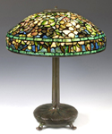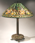 At the final phase of development are shades with both irregular upper and lower borders. In this group the artificial straight edge of the aperture is replaced by an openwork crown that simulates tree branches or shrubbery. Finials have been eliminated, and light and heat are diffused through the crown. The combination of the irregular upper and lower border is the consummate Tiffany Studios Shade.