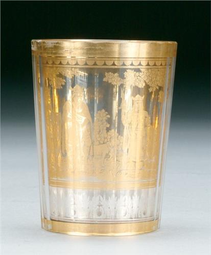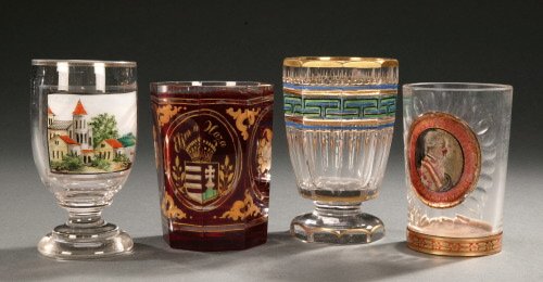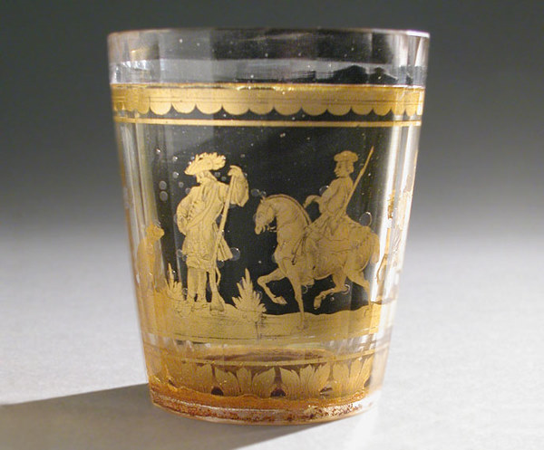The design is most commonly seen in glasses, beakers, goblets, and other decorative vessels. Often, the gold leaf is ornately cut or bears an intricate design. In some pieces the outer glass panel is engraved, or silver leaf is used in place of gold. Religious icons, hunting, war scenes, and heraldry are some of the most common themes.