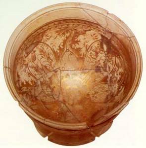 Zwischengoldglas is a glassware technique in which gold foil is inserted between two glass panels. The pieces are designed to fit perfectly over each other, so that the gold appears to float in the glass. Zwischengoldglas is different from other styles in that the pieces are bonded with cement rather than fused together, as is common in Roman and Hellenistic gold glass. This made production fast and easy, which helped make it one of the most popular ornaments of its time.