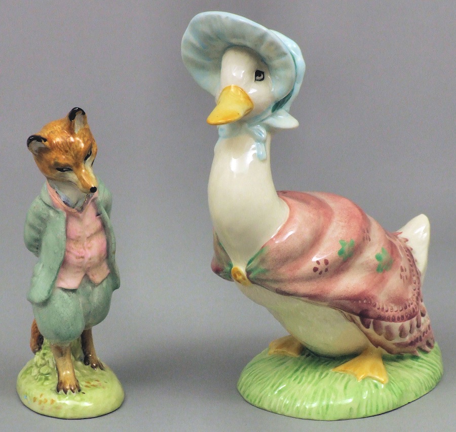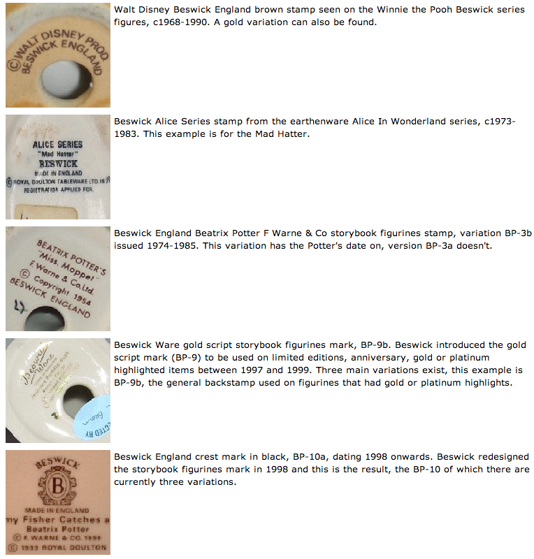 In 1948 the company began producing characters from the Beatrix Potter story books. It was John Beswick who first received the rights to reproduce the characters and 1997 marked the 50th year that Beswick and Royal Doulton had been producing Beatrix Potter figures. The initial range produced in 1948 consisted of 10 figures.