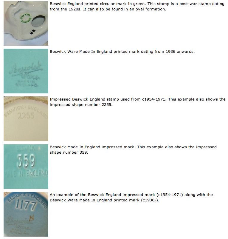 James Wright Beswick founded his pottery business “J. W. Beswick” , in Longton, Stoke-on Trent, England in 1892. His sons John and Gilbert along with John’s son, John Ewart all played a part in the factories tremendous success. Initially producing tableware and ornaments. After the 1914-1918 war they started to branch out producing more fancy wares for the home and abroad.