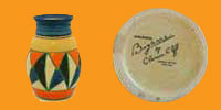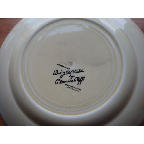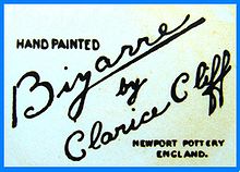 The name Bizarre was initially introduced to promote an experimental range of geometric designs painted onto old Newport Pottery stock. The experiment proved a tremendous success and the name itself came to symbolize her work. From July 1928 it appeared on virtually all her pieces until eventually withdrawn in 1936. Early geometric pieces are usually described as Original Bizarre.