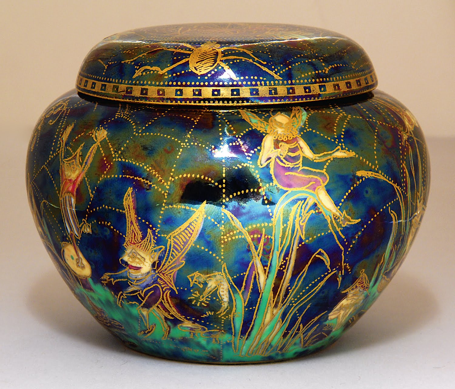 However, these earlier pieces should not be confused with true Fairyland Lustre. This first appeared in 1915, by which time Daisy’s imagination was beginning to run riot. Rich blues, purple, orange (her favourite colour) yellow, green and gold, were all worked together with pixies, elves and sprites in ways reminiscent of book illustrations by Edmund Dulac and Arthur Rackham.