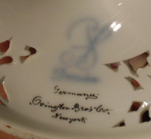 Dresden china is often described as “rococo revival” style. Rococo comes from the French word “rocaille” meaning rock work or grotto work, and refers to the artificial grottoes used in French gardens that were decorated with irregularly shaped stones and seashells. Originally popular during the renaissance, rococo experienced a revival during the 19th century, touching virtually all aspects of interior design. Dresden decorators were the first and most successful to employ this style on dinnerware, characterized by elaborate fanciful design and a profusion of foliage, flowers, fruits, shells and scrolls.