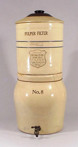 Fulper’s most notable product at the turn of the century was the patented Germ-Proof Filter. Forerunner to today’s “water cooler” the filters were exceedingly popular at a time when public water supplies, when they existed, were not necessarily the most sanitary. Fulper’s Germ Proof Filters were fixtures in railroad stations, offices and schools throughout North America, South America and the West Indies.