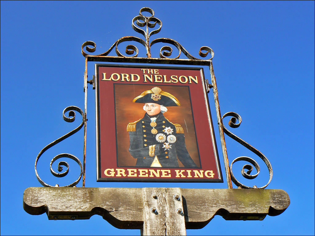 Britain’s maritime situation and military adventures have produced the Ship, Anchor, Mermaid, Dolphin, Trafalgar, Nelson etc., and The Gun, Infantryman, Bugle, also Waterloo and many other (victorious) battles, with Admirals and Generals well represented. This rather bloodthirsty roll call is somewhat alleviated by humour (at least for males – the principal drinkers); The Silent Woman (depicted as wearing a scold’s bridle, or actually beheaded), The Load of Mischief (a man carrying a fat rowdy wife), and so forth.
