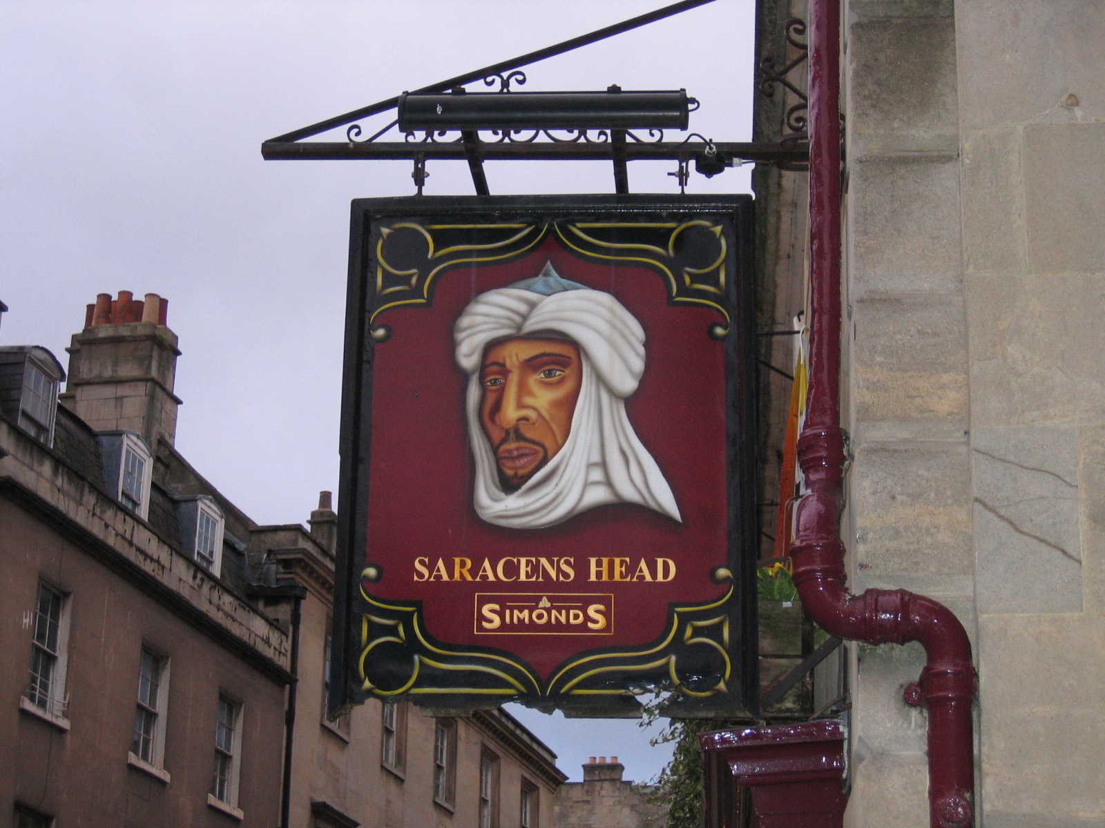 The church was a major supplier of refreshments to travellers and monasteries all brewed their own beer and offered accommodation. Pubs named The Golden Key, Adam and Eve, Pilgrims’ Rest and the moralistic The First and Last (an improvement on the earlier and depressing ‘Cradle and Coffin’), and the Mitre date from these early years of Christianity in Britain and are still around today. Later, knights and their supporters journeying to the various crusades, gave us The Saracen’s Head, and brought heraldic influences into the mix. Most of the Red Lion, Boar’s Head, Swan, White Hart and such motifs come from noble crusader families’ coats of arms. Aristocratic landowners too gave their names (with arms) to appropriately situated inns. Pubs in towns and cities often were associated with urban occupations, crafts or guilds and were signed accordingly; Goldbeater’s Arms, Porter’s Butt (i.e. barrel), Lamplighter etc, but curious combinations arose when, for example an established business moved into premises formerly occupied by another whose sign was still a local landmark (and not easily dispensed with). So names like The Sun and Moors Head, The Queen’s Head and Artichoke (still in Albany Street), and Blue Peruke and Star came about. The Devil and Bag O’Nails actually belongs in the religious category ( the Devil and Baccanals) as does The Goat and Compasses (God Encompasseth Us). Some areas of London take their name from the original (village) pubs; Gospel Oak, Nine Elms, The Angel etc. Royal symbols; Crown, Crown and Sceptre, King’s and Queen’s Heads (and royal Arms), were more urban than rural, but widely distributed