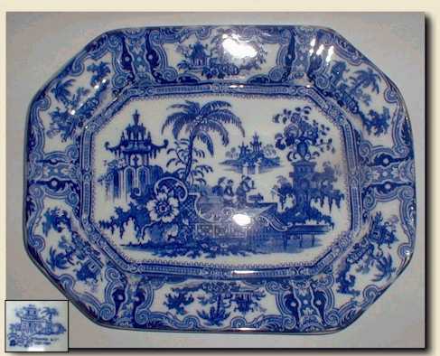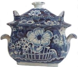 The very substantial quantity of marked pieces to be found in America is indicative both of the size of the firm and the importance of its export trade to the United States. Documentary evidence dating to 1840-41 gives the number of employees at the three factories comprising the Lower Works Stoke as 578 and states We do chiefly with the North and South American market, and but little for home [iv]. Despite the size of the business, only two printed patterns in the dark blue tone with specifically American subjects have been recorded; one is ‘The Seal of the United States’, the other ‘Mitchell & Freeman’s China and Glass Warehouse, Chatham St, Boston.’ The subject matter of the latter helpfully dates it to around 1828-31, placing wares with this pattern towards the latter end of the fashionable period for the very dark blue.