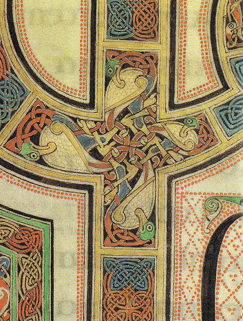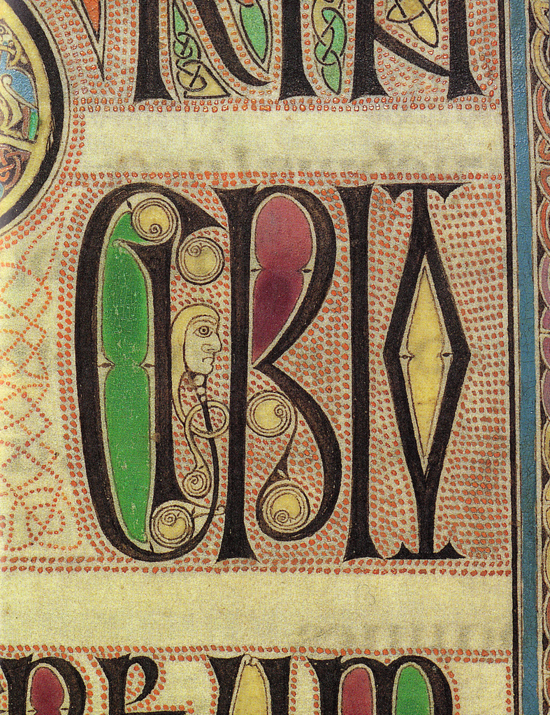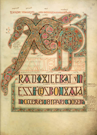 His superb skill is evident in the opening pages of each gospel. A painting of the gospel’s Evangelist is followed by an intricately patterned ‘carpet’ page. Next is the ‘incipit’ page, that is, an opening page in which the first letters of the gospels are greatly elaborated with interlacing and spiral patterns strongly influenced by Anglo-Saxon jewellery and enamel work.