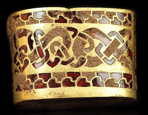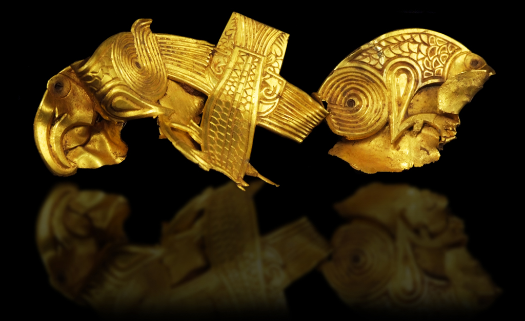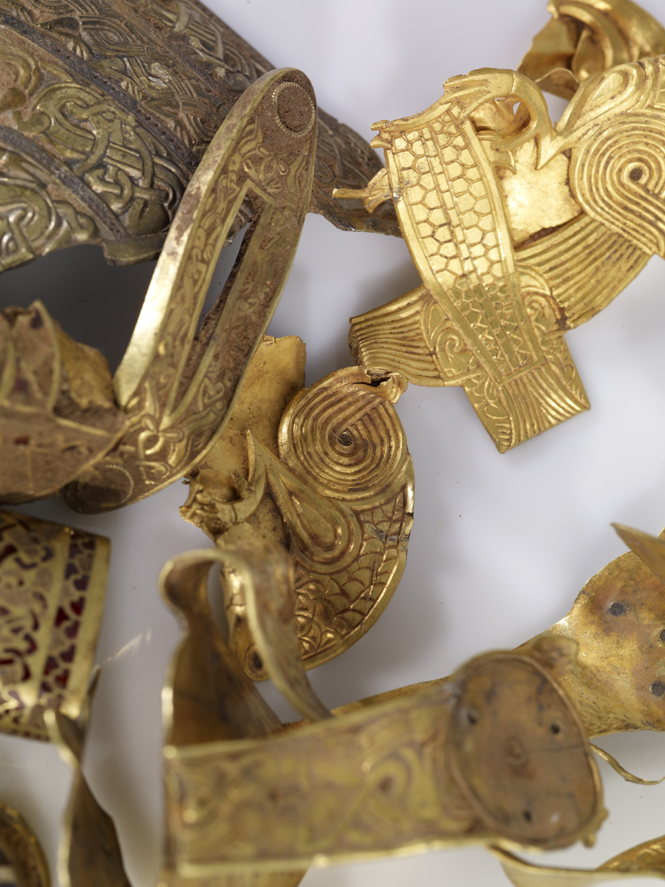 They are still arguing about the date some of the pieces were made, the date they went into the ground, and the significance of most seemingly wrenched off objects they originally decorated. There are three Christian crosses, but they were folded up as casually as shirt collars. A strip of gold with a biblical inscription was also folded in half: it reads, in occasionally misspelled Latin, “Rise up O Lord, and may thy enemies be dispersed and those who hate the be driven from thy face.”