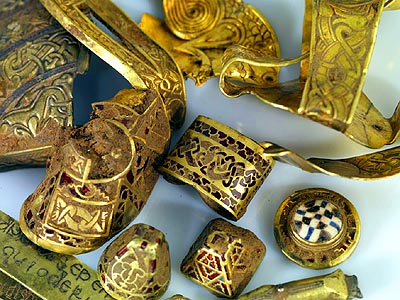 The gold includes spectacular gem studded pieces decorated with tiny interlaced beasts, which were originally the ornamentation for Anglo-Saxon swords of princely quality: the experts would judge one a spectacular discovery, but the field has yielded 84 pommel caps and 71 hilt collars, a find without precedent.