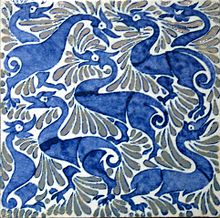 In 1863 De Morgan had his first real career break when he met William Morris and the painter Edward Burne Jones. As Morris had not been very successful with ceramics, De Morgan took over the tile production side of the business and soon began designing his own tiles. He collaborated with William Morris for many years.