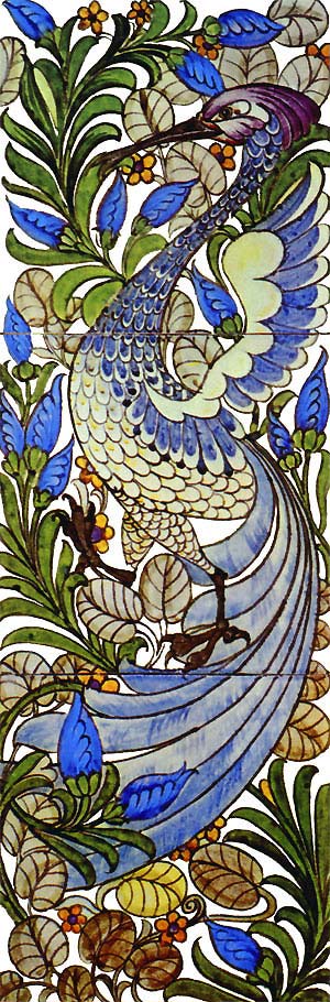 Whilst still at the beginning of his career and experimentations with ceramic making, De Morgan was commissioned by Frederic Lord Leighton to install the Turkish, Persian and Syrian tiles which he had collected on his travels, into the Arab Hall of his house which was designed by architect George Aitchison. De Morgan was able to make up deficiencies in many of the panels and completely tiled the entrance hall and staircase with tiles of an intense Turkish turquoise. This early introduction to the rich and varied patterns of the Middle East was to influence De Morgan throughout his career.