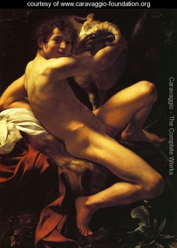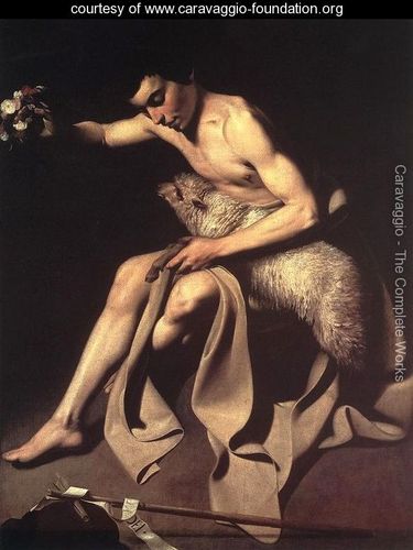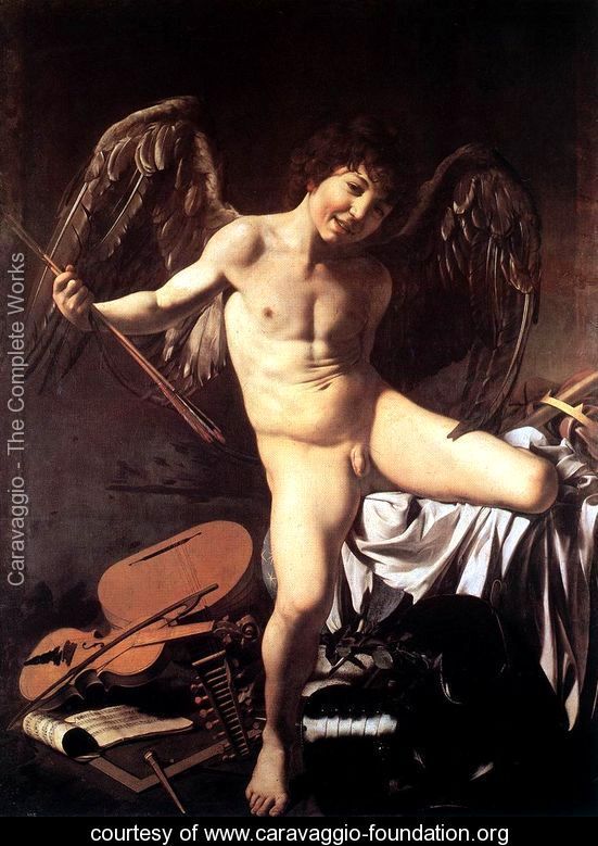 One secular piece from these years is Amor Victorious, painted in 1602 for Vincenzo Giustiniani, a member of Del Monte’s circle. The model was named in a memoir of the early 17th century as “Cecco”, the diminutive for Francesco. He is possibly Francesco Boneri, identified with an artist active in the period 1610-1625 and known as Cecco del Caravaggio (‘Caravaggio’s Cecco’), carrying a bow and arrows and trampling symbols of the warlike and peaceful arts and sciences underfoot. He is unclothed, and it is difficult to accept this grinning urchin as the Roman god Cupid – as difficult as it was to accept Caravaggio’s other semi-clad adolescents as the various angels he painted in his canvases, wearing much the same stage-prop wings. The point, however, is the intense yet ambiguous reality of the work: it is simultaneously Cupid and Cecco, as Caravaggio’s Virgins were simultaneously the Mother of Christ and the Roman courtesans who modeled for them.