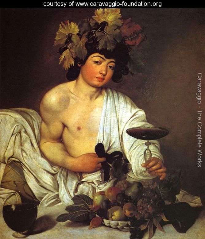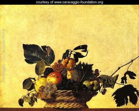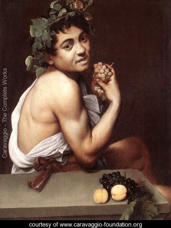 Caravaggio fled Milan for Rome in mid-1592 after “certain quarrels” and the wounding of a police officer. He arrived in Rome “naked and extremely needy … without fixed address and without provision … short of money.” A few months later he was performing hack-work for the highly successful Giuseppe Cesari, Pope Clement VIII’s favourite painter, “painting flowers and fruit” in his factory-like workshop. Known works from this period include a small Boy Peeling a Fruit (his earliest known painting), a Boy with a Basket of Fruit, and the Young Sick Bacchus, supposedly a self-portrait done during convalescence from a serious illness that ended his employment with Cesari. All three demonstrate the physical particularity – one aspect of his realism – for which Caravaggio was to become renowned: the fruit-basket-boy’s produce has been analysed by a professor of horticulture, who was able to identify individual cultivars right down to “… a large fig leaf with a prominent fungal scorch lesion resembling anthracnose (Glomerella cingulata).”