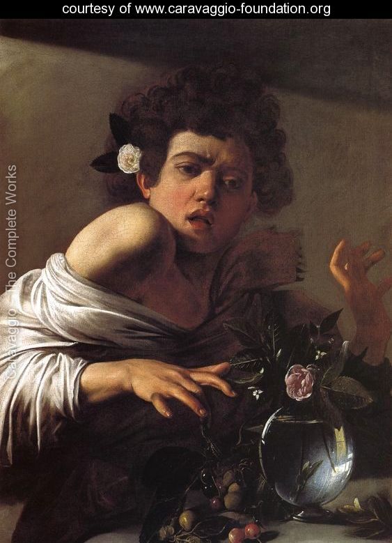 Born Michelangelo Merisi, Caravaggio is the name of the artist’s home town in Lombardy in northern Italy. In 1592 at the age of 21 he moved to Rome, Italy’s artistic centre and an irresistible magnet for young artists keen to study its classical buildings and famous works of art. The first few years were a struggle. He specialised in still lifes of fruits and flowers, and later, half length figures (as in ‘The Boy bitten by a Lizard’) which he sold on the street.