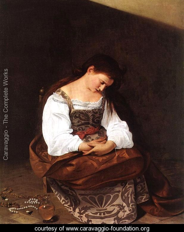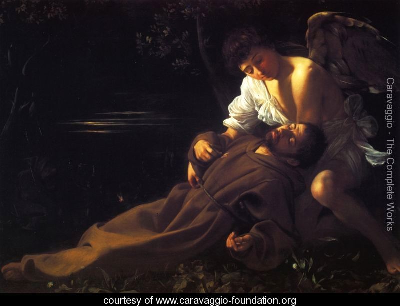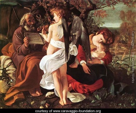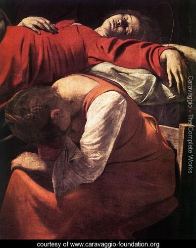 The realism returned with Caravaggio’s first paintings on religious themes, and the emergence of remarkable spirituality. The first of these was the Penitent Magdalene, showing Mary Magdalene at the moment when she has turned from her life as a courtesan and sits weeping on the floor, her jewels scattered around her. “It seemed not a religious painting at all … a girl sitting on a low wooden stool drying her hair … Where was the repentance … suffering … promise of salvation?” It was understated, in the Lombard manner, not histrionic in the Roman manner of the time. It was followed by others in the same style: Saint Catherine, Martha and Mary Magdalene, Judith Beheading Holofernes, a Sacrifice of Isaac, a Saint Francis of Assisi in Ecstasy, and a Rest on the Flight into Egypt. The works, while viewed by a comparatively limited circle, increased Caravaggio’s fame with both connoisseurs and his fellow-artists. But a true reputation would depend on public commissions, and for these it was necessary to look to the Church.