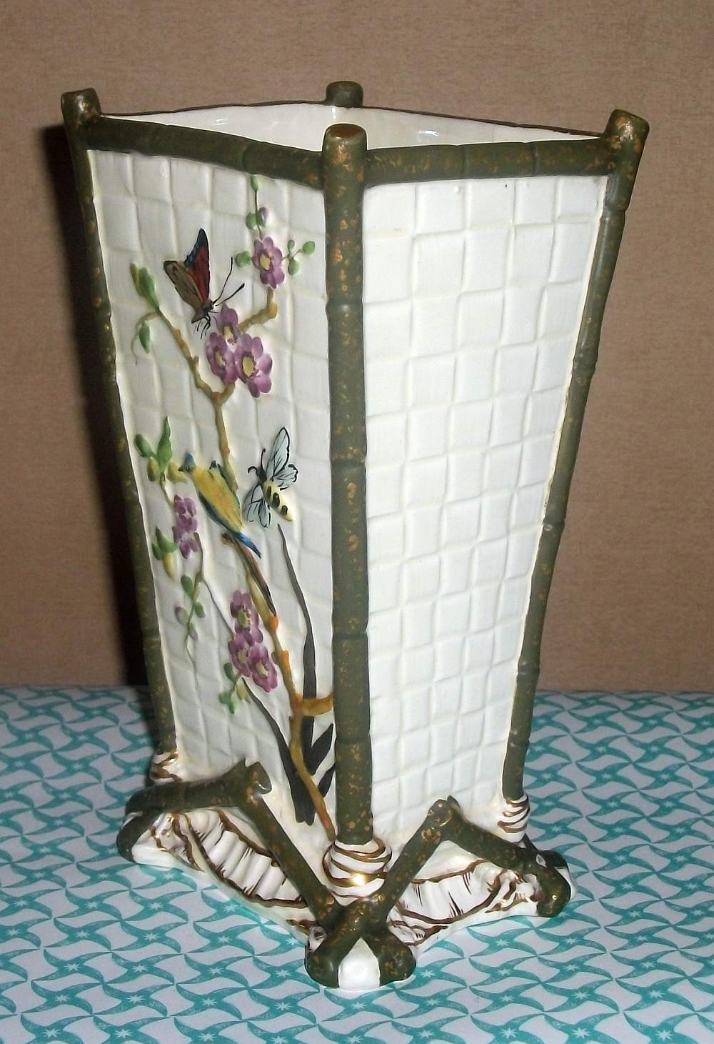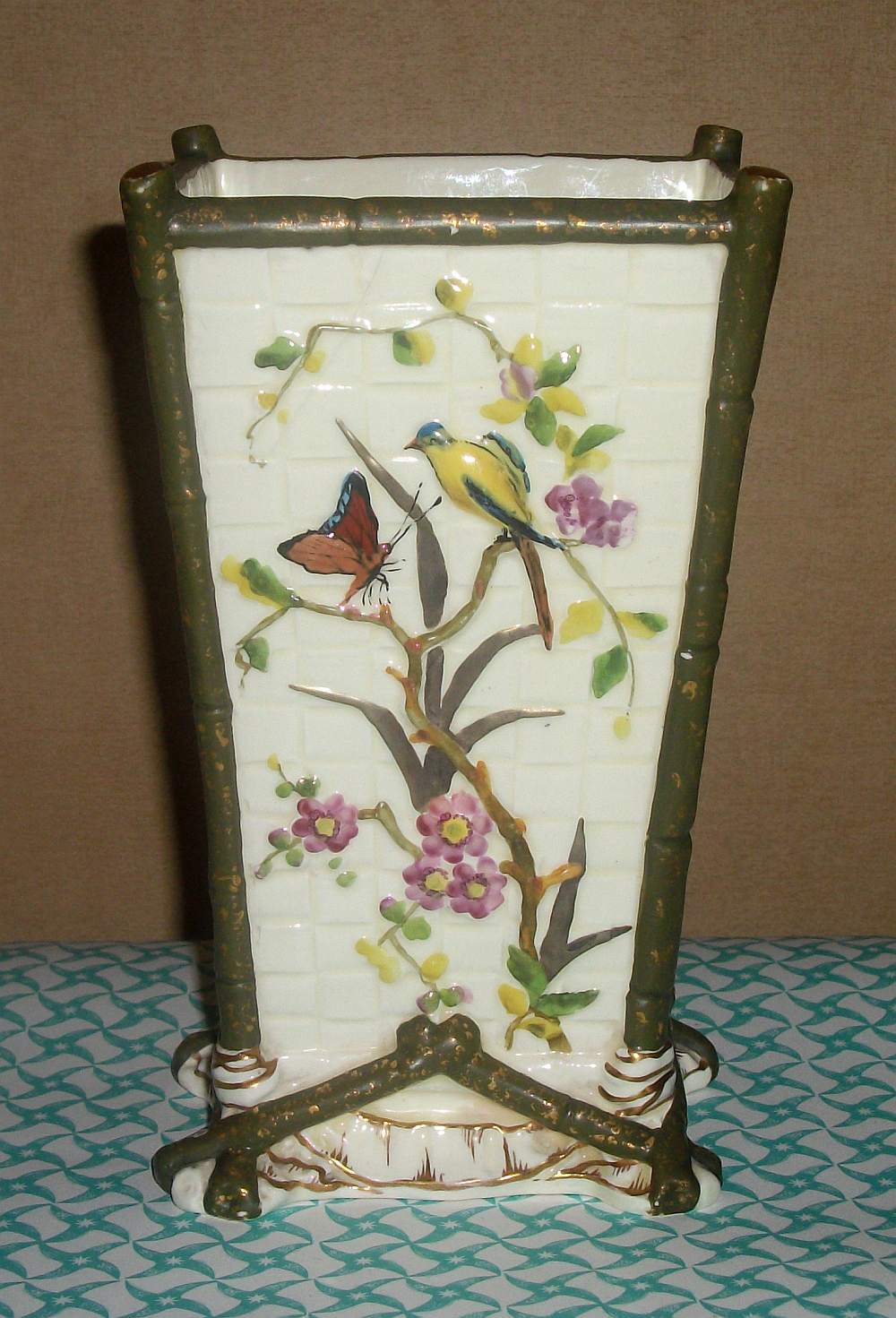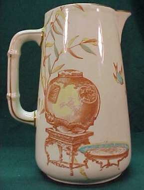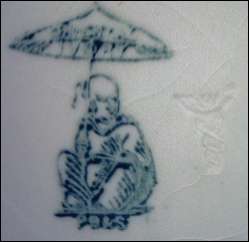 In 1880, Powell, Bishop and Stonier registered a new trademark to accompany their ivory or cream coloured earthenware. This shows a seated Chinaman under a sunshade or umbrella containing the words ORIENTAL IVORY – their name for the earthenware body. This oriental ivory body and their green bodied porcelain were ideal vehicles for Japanese inspired designs which were popular in the Victorian period. These often featured asymmetrical floral and bird designs.