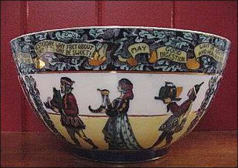 - Bishop & Stonier began producing Aztec Ware in the 1920’s, This large fruit bowl or punch bowl perhaps measures 10 1/4 inches in diameter, and just over 5 inches in height. It features a Shakespearian repeating pattern of attendants and verse that reads: “May good digestion wait on appetite and health on both better be merry with the fruitful grape than sadder after none, or bitter, fruit. Unborn to-morrow and dead.” The bowl has a bluish/black transfer printed border with hand-painted gold lustre and green leafy details. The characters are mostly hand-painted with a bright, vibrant lustre-type paint.