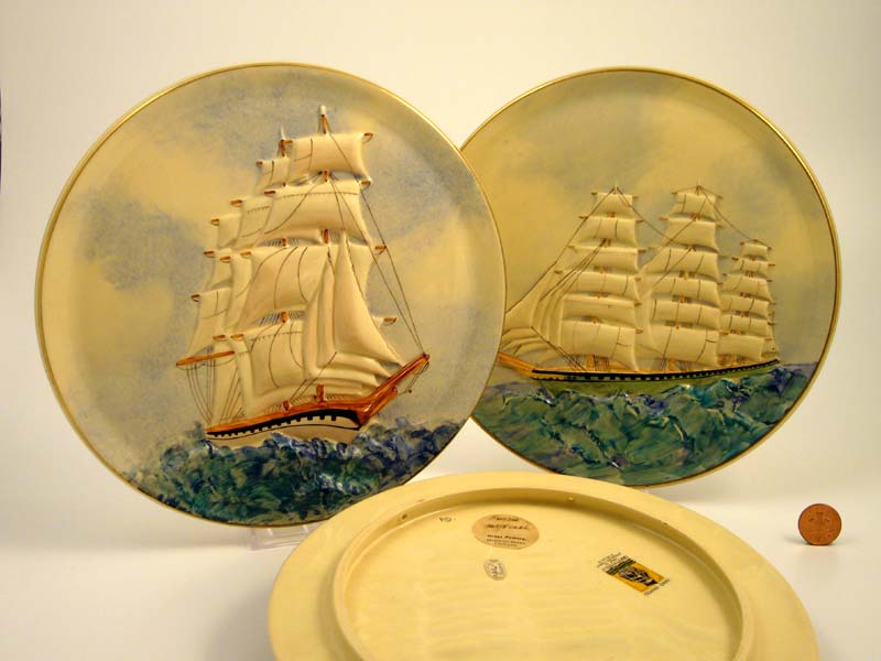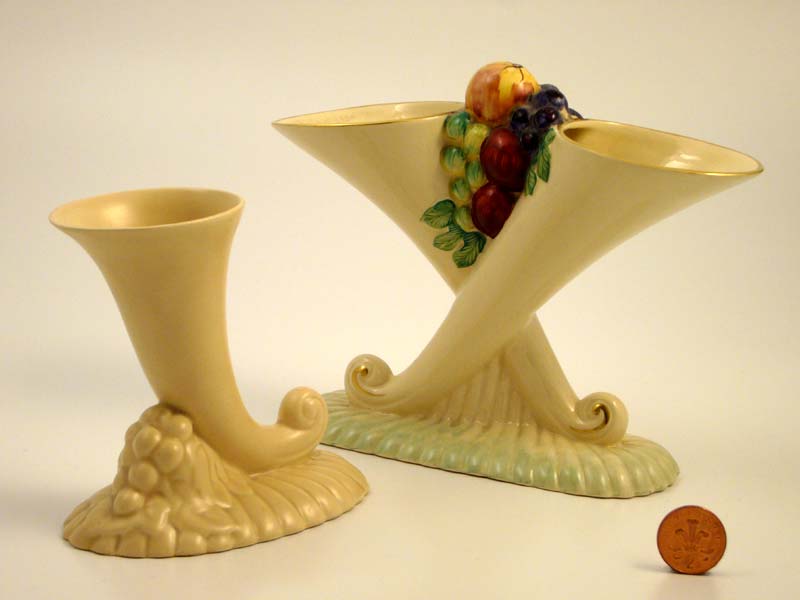 Joan designed items in the buff-bodied wares of the mid-to-late 1930s such as wall pockets for flowers, single and double free-standing cornucopia and large circular wall plaques with relief moulded sailing ships