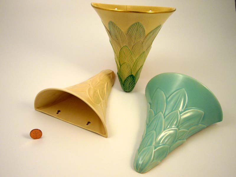 - These wall pockets were supplied in two sizes (the small size, 215 high, illustrated here) and in various colourways: undecorated, green leaves, autumn leaves etc. They were made exclusively for Gray’s Pottery by Kirklands. Matt straw glaze, mark R2. A4691, green shaded leaves, mark R2. Green glaze, mark R2.