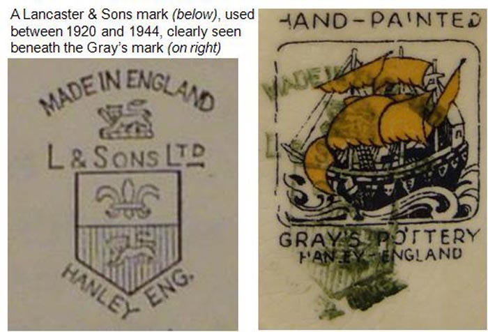 Because Gray’s Pottery was a decorating business – buying undecorated ‘white ware’ from other pottery manufacturers – the pieces that the company bought usually already had a backstamp. Many Gray’s pieces therefore often have two backstamps (ILLUSTRATION 3) : the original maker’s mark and the Gray’s mark on top of it, usually large enough and bold enough to obscure the mark beneath. Mr Gray would not necessarily want the white ware producer to take any credit for the pottery, hence his use of bold backstamps.