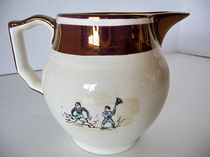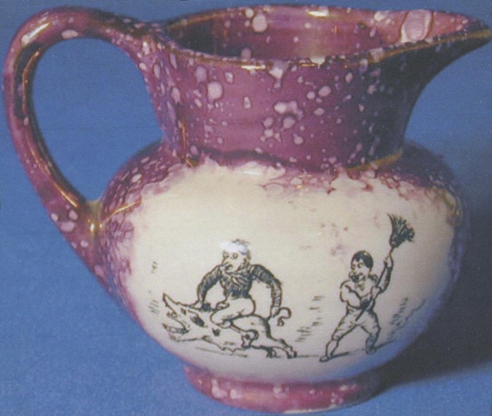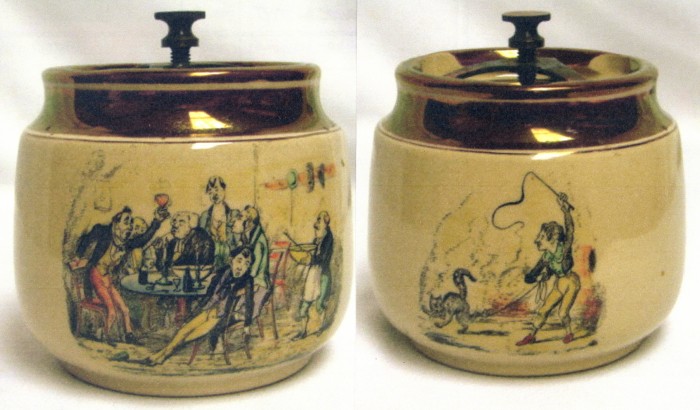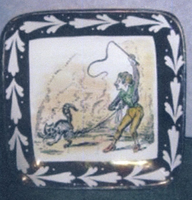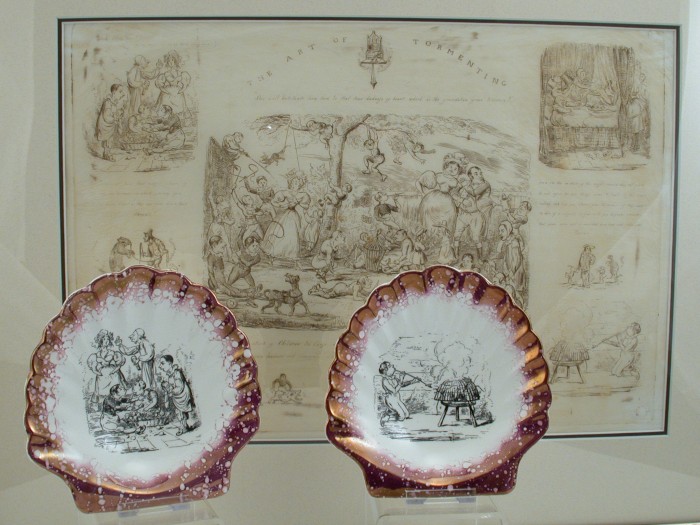 At some time during the early years of Gray’s Pottery, it is likely that AE Gray acquired a book called Heath’s Caricature Scrapbook. This is a 60-page publication from 1840 containing etchings by Henry Heath. Each page, produced from a copper printing plate, measures 400x275mm (16″x11″). In the 1980s, one of the original plates, No 4 The Art of Tormenting section, was given by AE Gray’s son Robin to The Potteries Museum in Stoke-on-Trent, England.