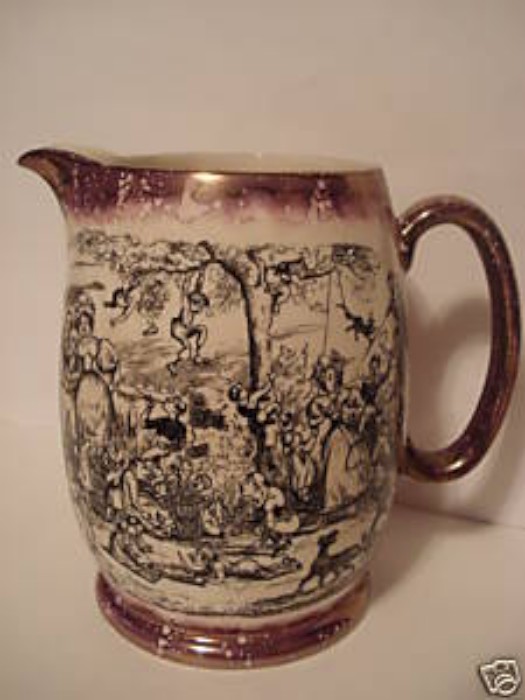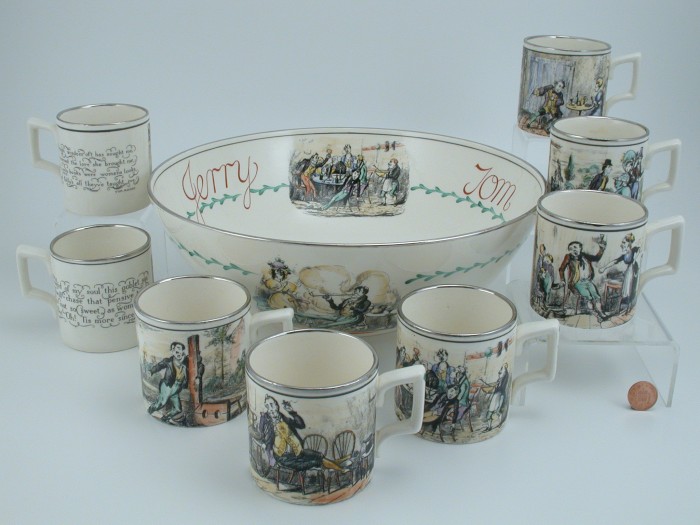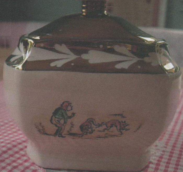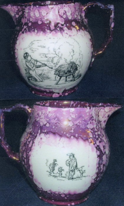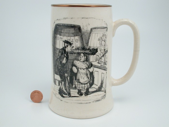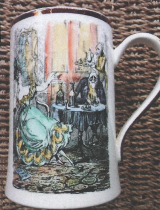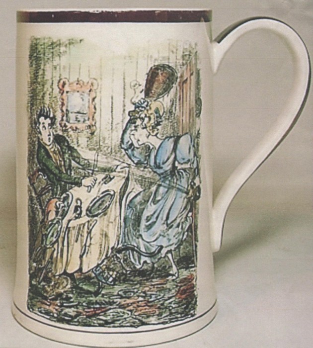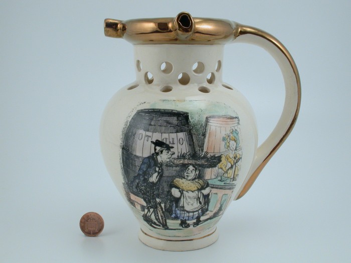 Because Heath’s engravings were designed for book use, they became reversed images when applied to pottery in the process described above. For this reason, any text accompanying the image was removed. The only exception appears to be in Scenes in London No 42 where a large barrel of Old Tom gin appears in the background. On Gray’s pots using this print, such as tankards (pattern A8904 and an unknown un-enamelled pattern ) or the puzzle jug (pattern A9010), the words appear as .