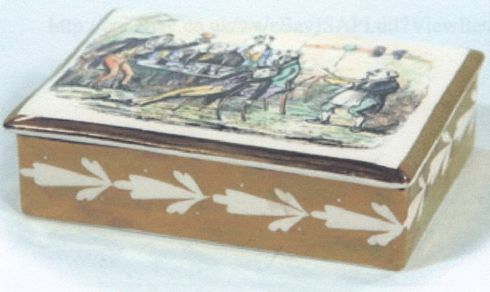 Based on records to date, Gray’s lowest pattern number to have a Heath print is A8651, a design dating from about 1948. The prints then continue to appear on later A8000 series numbers and throughout the A9000 series. One ‘D’ series number, D1477, from the mid-to-late 1950s, is the youngest recorded pattern with a Heath print. Note that a news feature in a 1951 Pottery Gazette magazine (June p.924) illustrates three different prints, captioned as follows: “Scenes from Dickens” – Interesting examples from a new Dickens series comprising tankards, goblets, candy boxes, trays, butters, teaware, etc. The scenes are from old book engravings, and all pieces are available in print-and-enamel decorations (illustrated) or as plain prints as desired.