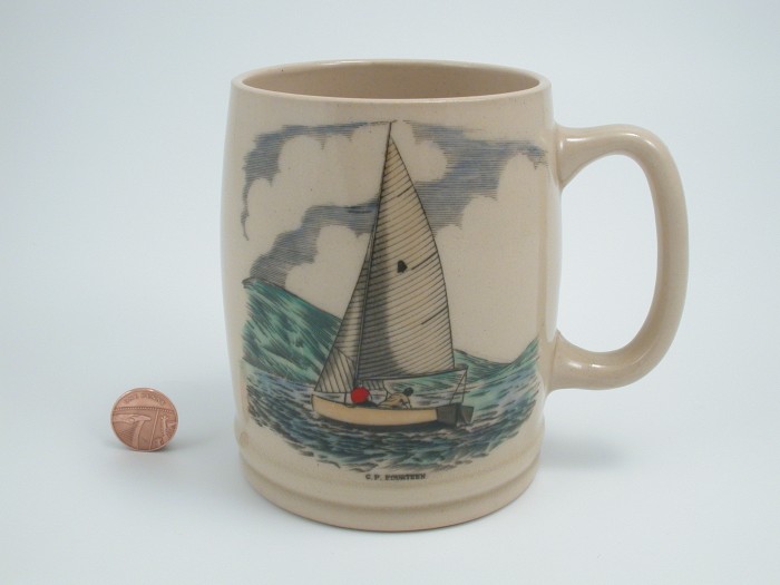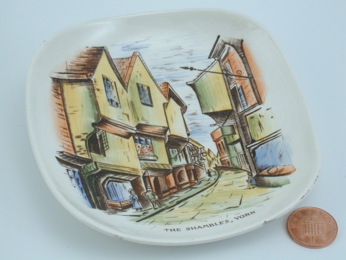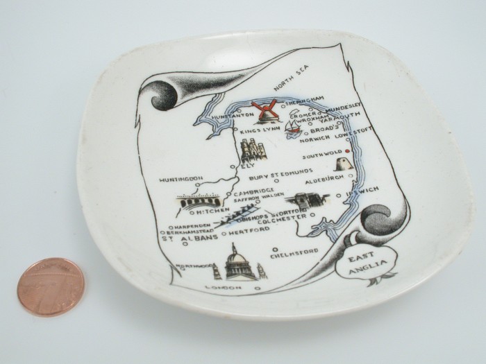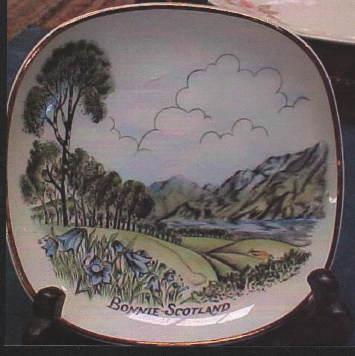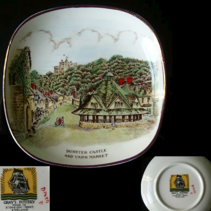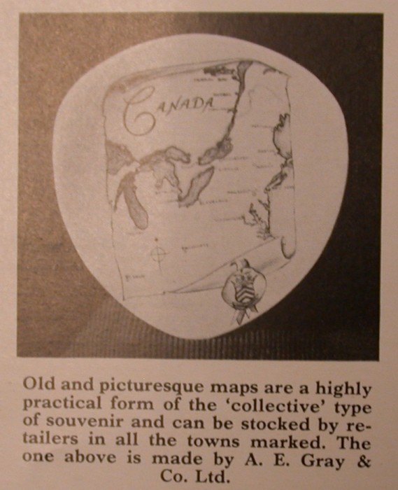 In an article on souvenir merchandise in a 1956 Pottery and Glass magazine (December pps392&393), the use of‘collective subjects … on pottery’ refers to AE Gray & Co Ltd “… having found that several watering-places are also fishing ports, which can be served with a picture of a trawler.” Also that “Old and picturesque maps are a highly practical form of the ‘collective’ type of souvenir and can be stocked by retailers in all the towns marked.”Additionally, “For shops which conduct a lively tourist trade, it is well worth ordering a selection of tailor made souvenirs with pictures depicting a local scene.” Four Gray’s Pottery examples accompany the article, including prints of CanadaVictoria Falls and Nassau (pattern D566).