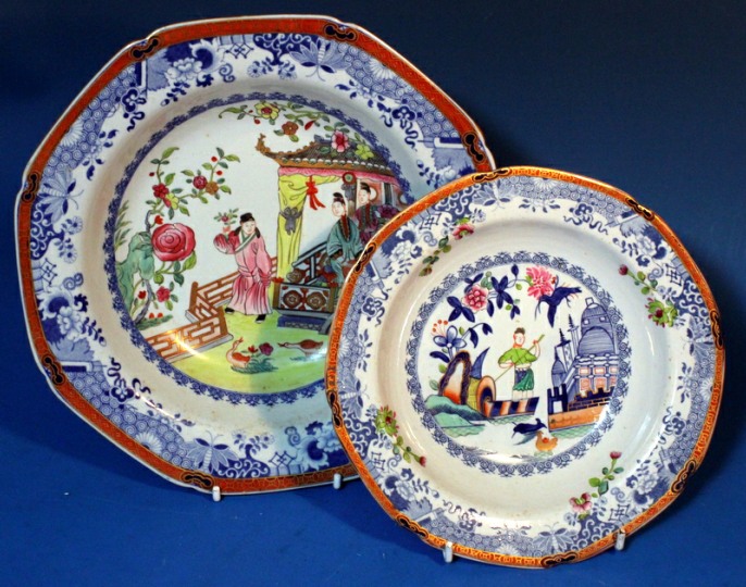 Josiah Spode I is credited with the introduction of underglaze blue transfer printing on earthenware in 1783-84. The Worcester and Caughley factories had commenced transfer printing underglaze and over glaze on porcelain in the early 1750s, and from 1756 overglaze printing was also applied to earthenware and stoneware. The processes for underglaze and overglaze decoration were very different. Overglaze “bat printing” on earthenware was a fairly straightforward process, and designs in a range of colours including black, red and lilac were produced.