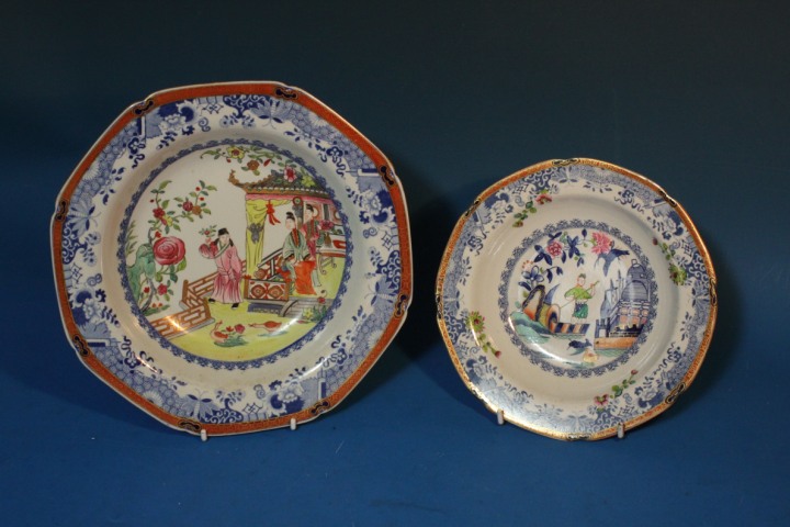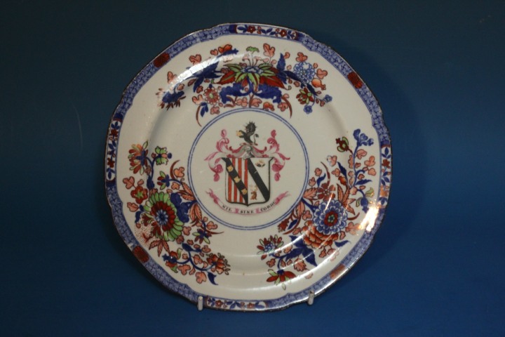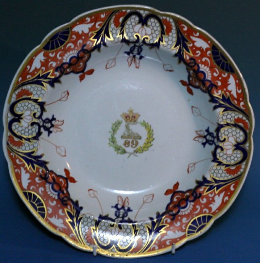 In Spode’s similar “Felspar porcelain”, introduced on the market in 1821, felspar was an ingredient, substituted for the Cornish stone in his standard bone china body, giving rise to his slightly misleading name “Felspar porcelain,”[8] to what is in fact an extremely refined stoneware comparable to the rival “Mason’s ironstone”, produced by Josiah II’s nephew, Charles James Mason, and patented in 1813 Spode’s “Felspar porcelain” continued into the Copeland & Garrett phase of the company (1833-1847).Armorial services were provided for the Honourable East India Company, 1823, and the Worshipful Company of Goldsmiths, c1824.[11] Some of the ware employed underglaze blue and iron red with touches of gilding in imitation of “Imari porcelain” that had been introduced on Spode’s bone china in the first decade of the century:[12] the most familiar “Tobacco-leaf pattern” (2061) continued to be made by Spode’s successors, William Taylor Copeland, and then “W.T. Copeland & Sons, late Spode”.