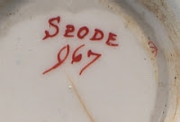 Start of the Spode business to 1833: the company was known as Spode. Pieces were not always marked and sometimes just a pattern number appears and no Spode name at all. Painted marks are often in red and marks can also appear printed usually in blue or black, (although other colours were used) or impressed into the clay so appearing colourless. It is possible to have a combination of all three. To the left is the image of a backstamp with the Spode name, the pattern number 967 and another small red cypher, which is a workman’s mark.
